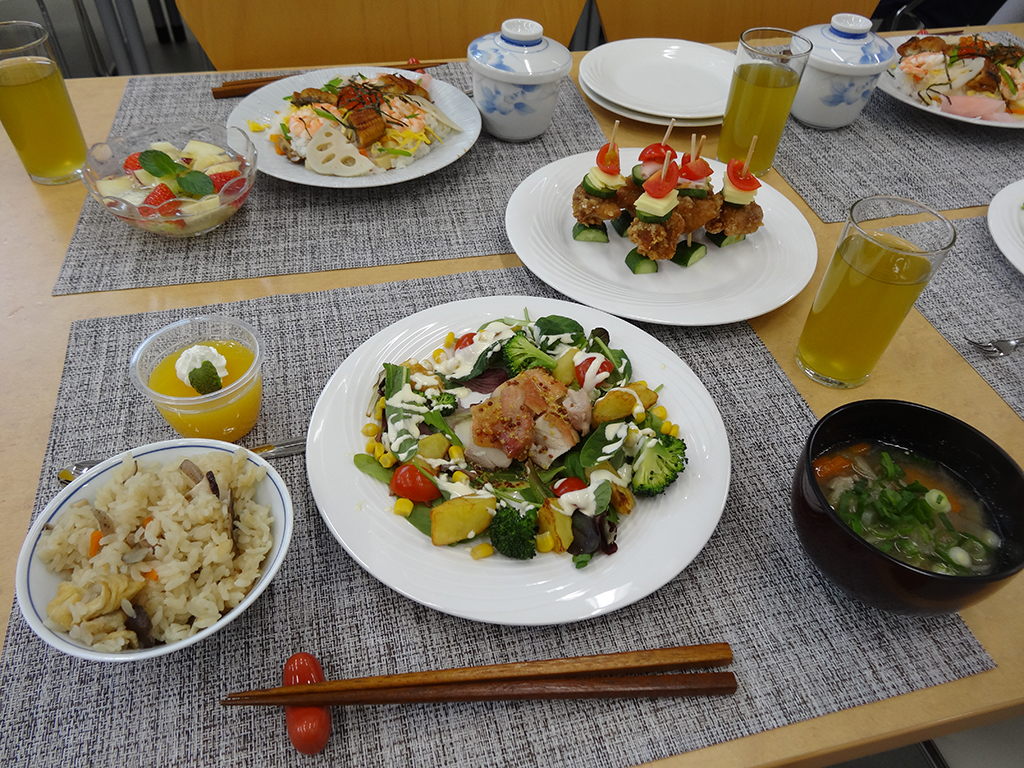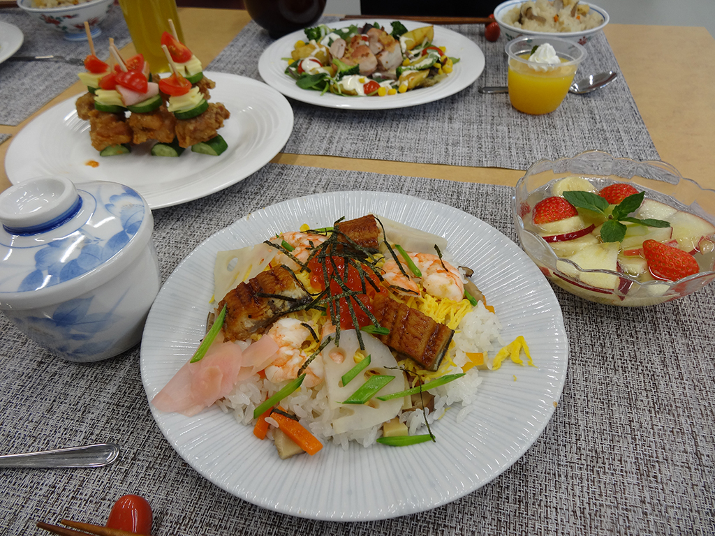 ちらし寿司、唐揚げのピンチョス風、茶わん蒸し、フルーツポンチ
