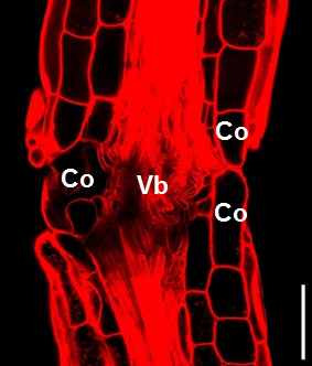 本研究ではシロイヌナズナの胚軸における傷の修復を明らかにするために、実態顕微鏡下で微小なシロイヌナズナの芽生えの胚軸間で接ぎ木した(図1A)。接ぎ木部は共焦点レーザー顕微鏡を使用することで、細胞の様子を詳細に観察することができるようになった。7日後における接ぎ木部は維管束組織が細胞分裂により肥大し、肥大した維管束組織を包むように皮層の細胞が成長を起こしていた(図1B)。