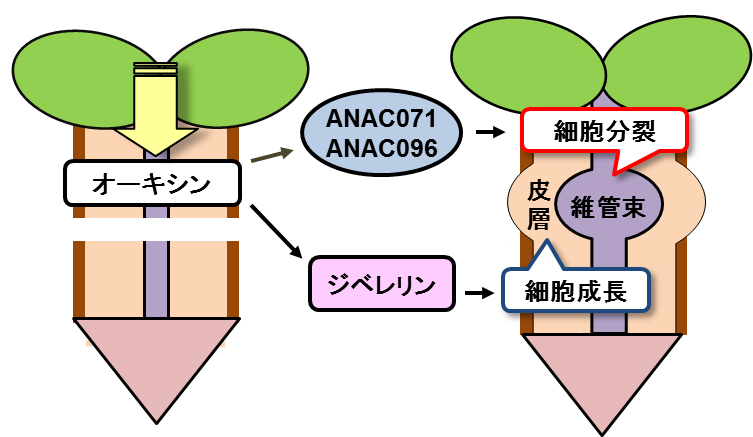 今回、共同研究グループはモデル植物であるシロイヌナズナの芽生えを用いて、オーキシンによって誘導される2つのNAC型(NAM, ATAF and CUC)転写因子が冗長的に働いて、胚軸間接ぎ木における維管束組織の細胞分裂を促進することを明らかにした。また、オーキシンが植物ホルモンのジベレリンの合成を促すことで、支持組織である皮層の細胞成長に関わることも判明した。