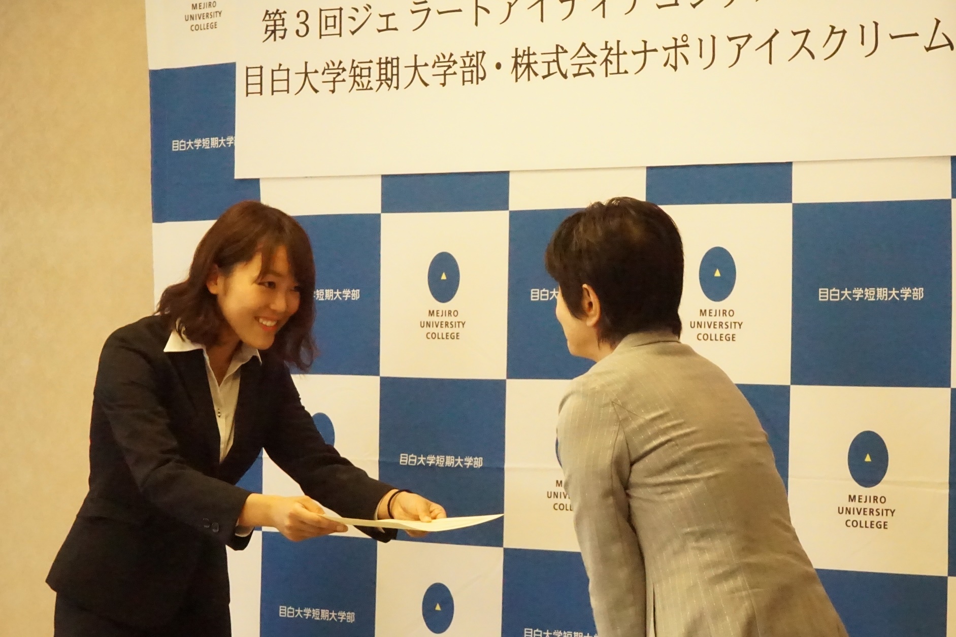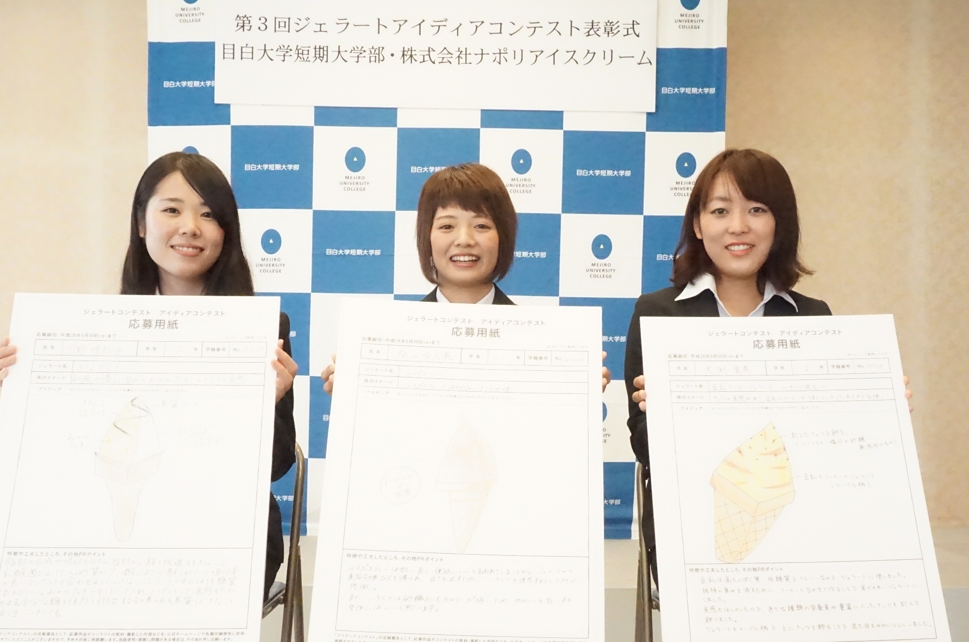 今年6月に開催した「第3回ジェラートアイディアコンテスト」では、「ヘルシージェラート」をテーマにアイディアを募集。163点ものアイディアが寄せられ、厳正な審査の結果、商品化される3案(優勝、準優勝、アイディア賞)が決定した。10月12日(水)には同短期大学部において表彰式が開催され、入賞した3名の学生に表彰状と記念品が贈呈された。