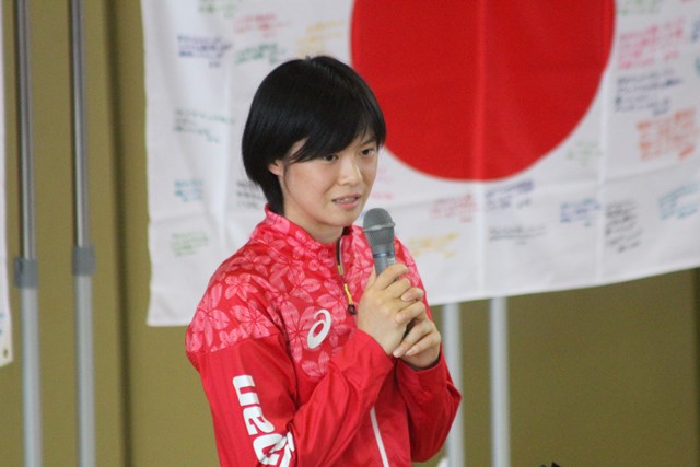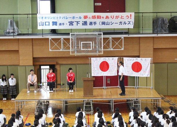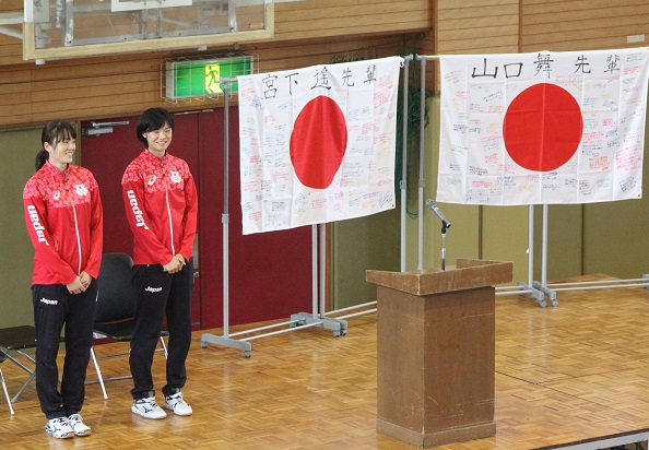 生徒会を代表して3年の岩本華奈さんが選手村の様子や今後の抱負を質問。生徒会長の阪本奈津美さんが「先輩は私たちの誇りです。全力で取り組むことの大切さを教えていただいた」と礼を述べ、バレーボール部員が寄せ書きした日の丸の旗を二人に贈った。