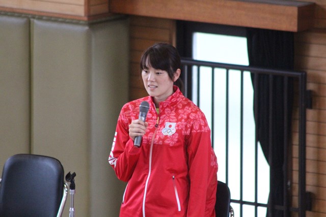 清水隆校長が「夢と感動、勇気を与えていただいた」と歓迎。河本監督が二人を紹介したあと、山口選手は「滝井は私の原点。何をするにも、すぐにはうまくいかないが、あきらめずに日々努力することが大切」と生徒たちに語りかけた。宮下選手は、「リオでは結果を出せなかったが、これもいい経験として次の目標に挑みたい」と話した。