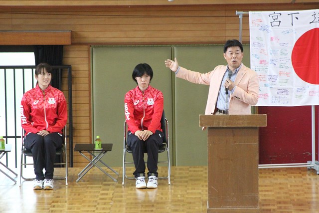 大和田中学校では、中井孝典校長が、宮下選手を紹介。宮下選手は、中学時代に全日本で準優勝した思い出などを話した。
