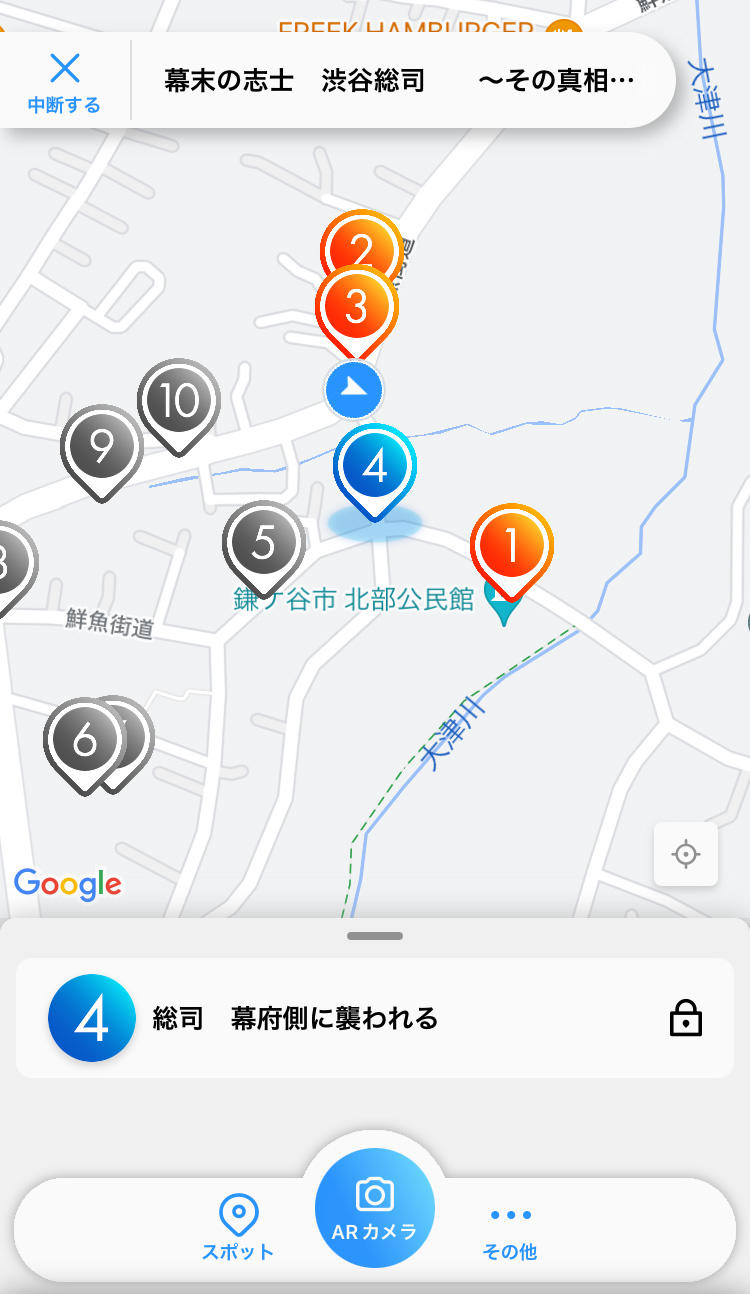 マップ上の指定されたスポットを巡る。ARカメラを起動すると実際の風景に澁谷総司が登場。一緒に写真撮影もできる。