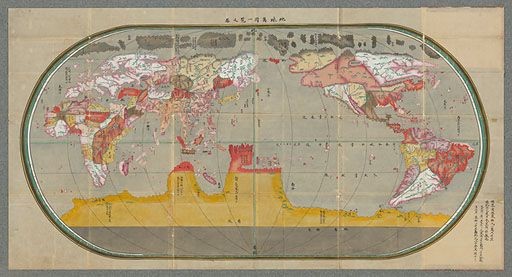 イエズス会の宣教師であるマテオ・リッチが中国(明)に伝えた世界地図をもとに描かれたもの。日本では、17世紀後半以降に、マテオ・リッチの世界地図を参考に長久保赤水らが多くの派生図を作成した。横長の楕円形をした形が特徴で「卵型世界地図」とも呼ばれている。