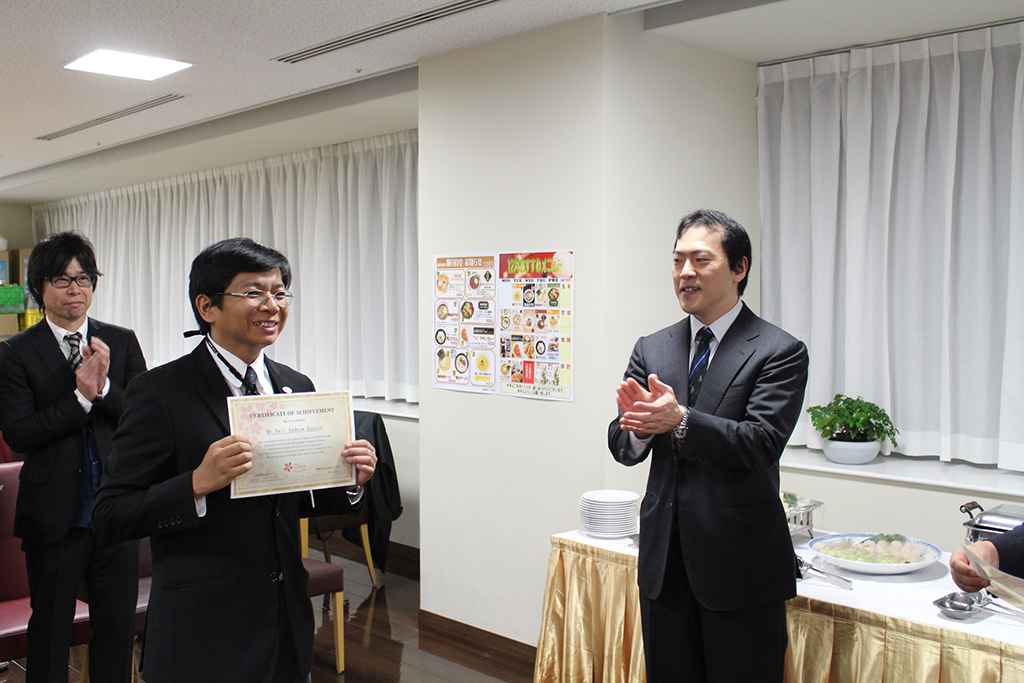 最終日には、約3週間にわたる研修の成果に対して、冲永佳史学長から修了証が手渡された。