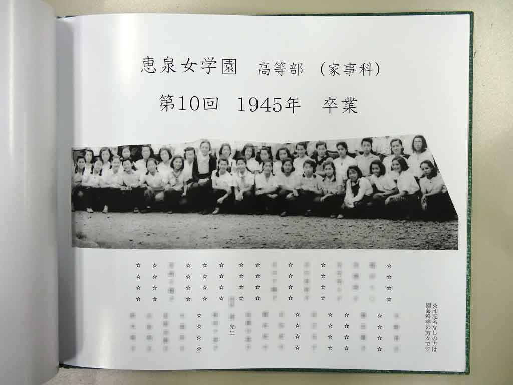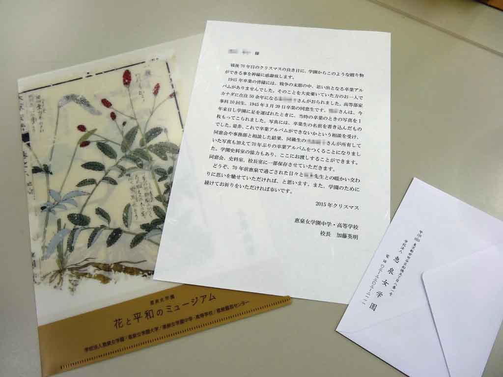 アジア・太平洋戦争末期に当たる1945年3月の卒業生には、戦火の混乱の中、思い出となる卒業アルバムを贈ることができなかった。そのことを大変憂えていた、現在はカナダに在住する卒業生Sさん(恵泉女学校高等部家事科10回生)が、当時の写真1枚を持って学園を訪問。これで卒業アルバムができないかという相談を受け、同校が同窓会や事務部とも相談した結果、同じく同級生のKさんが所有していた写真も加えて70年越しの卒業アルバムを完成させることができた。