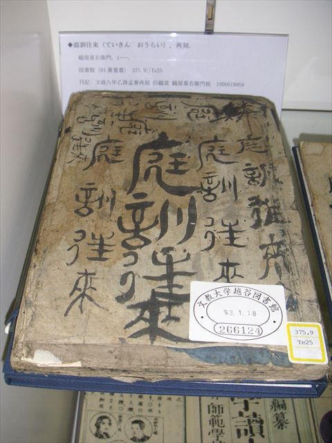 また、普段は配架されていないが、貴重書として所蔵している「漢籍コレクション」の中には「往来物」と呼ばれる平安時代末期から明治時代前期に使用された初等教科書があり、2014年に行われた館内展示では、教科書コレクションとともに展示した。