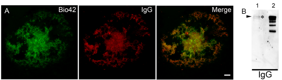 ②アミロイド斑内でBio42とIgG抗体が共存している(図2A)