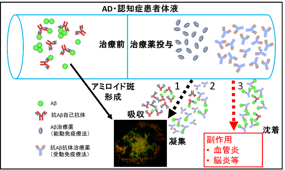 自己抗体には、Aβを排除すると共に、治療効果の低下や副作用を引き起こす二面性があります。この二面性を考慮することにより、有効な新規治療薬の開発が期待できます。