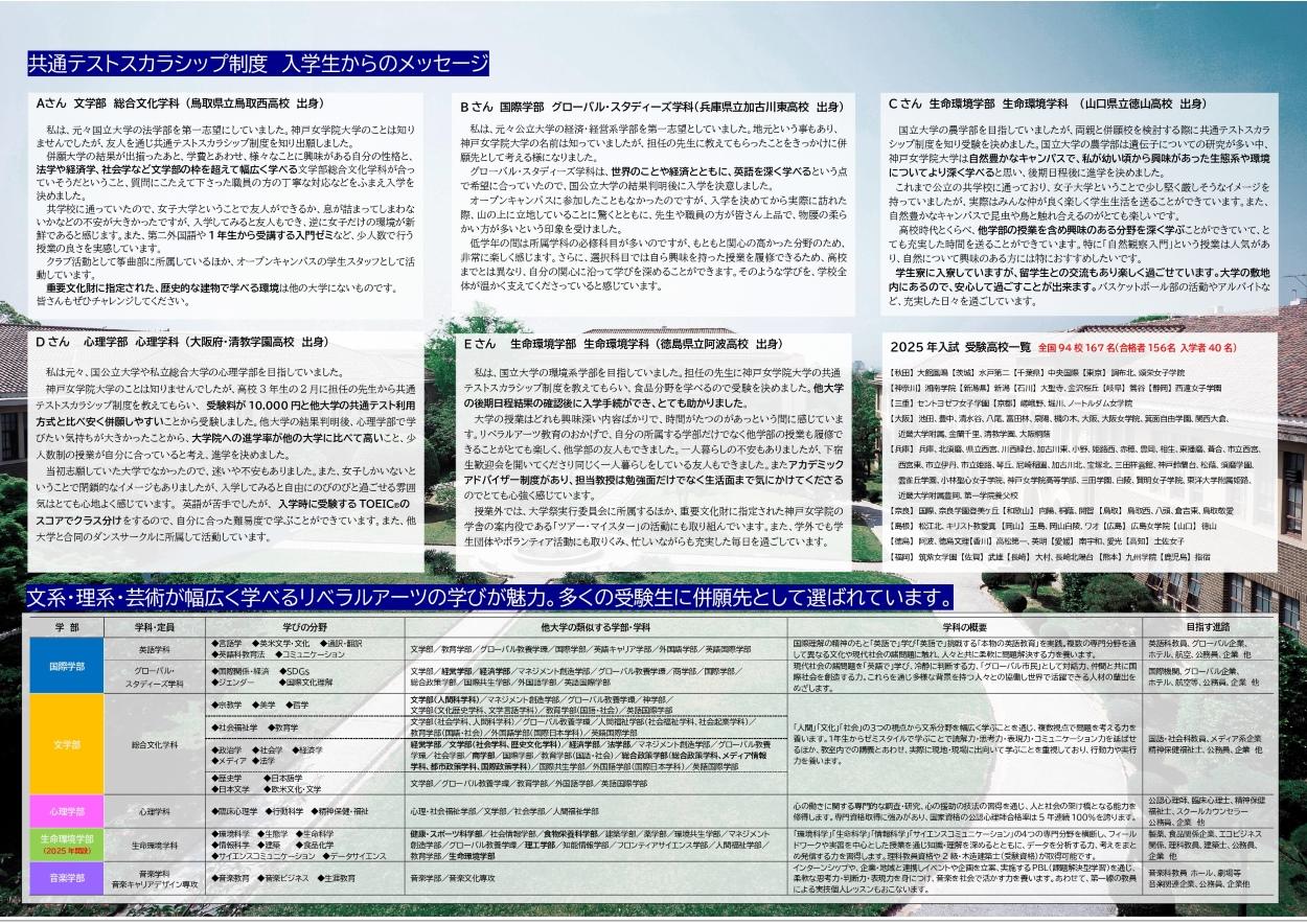 ※神戸女学院大学の他の入試制度(専願制を除く)との併願も可能。ただし「スカラシップ5科目型」内での複数学科併願は不可。