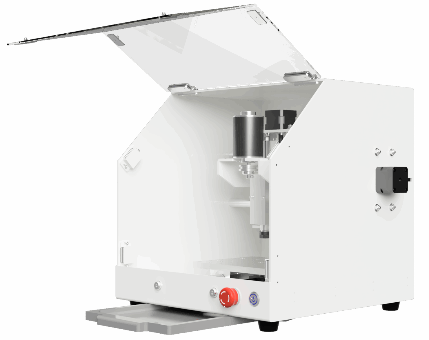 このCNCは、私自身が「本当に欲しかった一台」です。ロボコンの電子基板製作やアルミ加工で、既存の小型CNCが力不足であることに不満を持ち、「自分が納得できる一台」を目指して多くの試作を重ねました。モータの内部構造からベアリングの配置、ネジのリード角、筐体の板厚に至るまで、全てに理由があります。そして、加工後に机が散らからないという快適さを徹底的に追求しました。