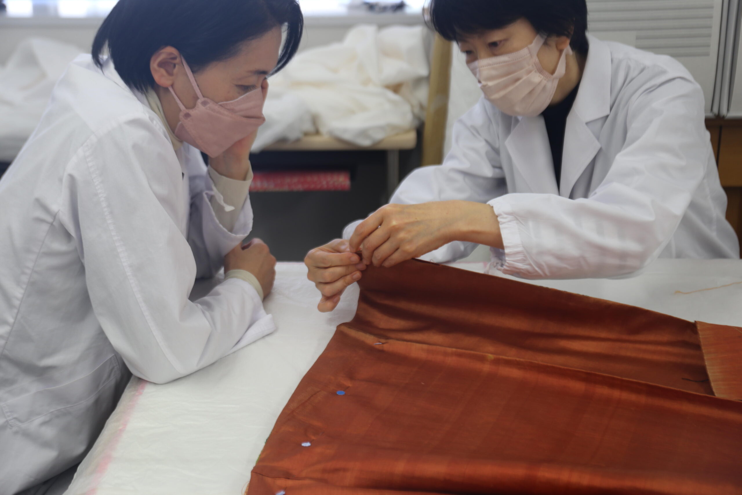 共立女子大学 家政学部 被服学科では、1950年代より約70年以上にわたり染織文化財の保存修復・復元の取り組みを続けてきました。歴代の和裁担当の教員らは全国各地の博物館・美術館、寺社仏閣が所蔵する染織文化財の調査や修復に携わり、そこで得られた知見をもとに精巧な復元作品も製作しています。こうした長年の取り組みで得られた知識と技術は現在も受け継がれています。