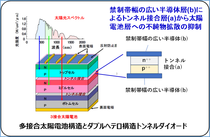 シリコン(Si)やガリウムヒ素(GaAs)などの一つの半導体材料で構成された単接合太陽電池の変換効率は、理論的には30%程度が限界である。しかし、宇宙用途では、衛星軌道の安定性などのため小面積で十分な電力が得られる必要があることから、さらに高い変換効率が求められる。この問題を解決するため、光の吸収波長の異なる複数の半導体材料からなる太陽電池を積層し、幅の広い太陽光スペクトルを有効に活用した多接合太陽電池の研究開発が世界的に行われている。その一方で、異なる材料の太陽電池を積層した接合部分において、高効率化の実現に必要な低い抵抗が得られないなどの問題があった。これに対し、複数の太陽電池を接続するトンネル接合層の両側を太陽電池材料と比較して禁制帯幅の広い半導体材料を含む薄い半導体層で挟んだダブルヘテロ構造トンネルダイオード(図1)を提案し、従来の課題を克服した。その結果、太陽光の利用効率を非集光で37.9%、集光下で44.4% (2013年当時世界最高効率)にまで向上させることができた。