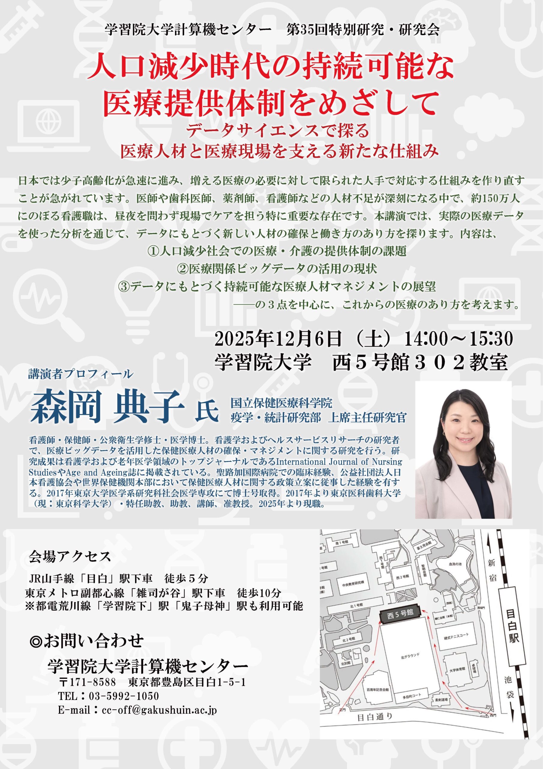 【学習院大学】計算機センター 第35回特別研究・研究会「人口減少時代の持続可能な医療提供体制をめざして:データサイエンスで探る医療人材と医療現場を支える新たな仕組み」