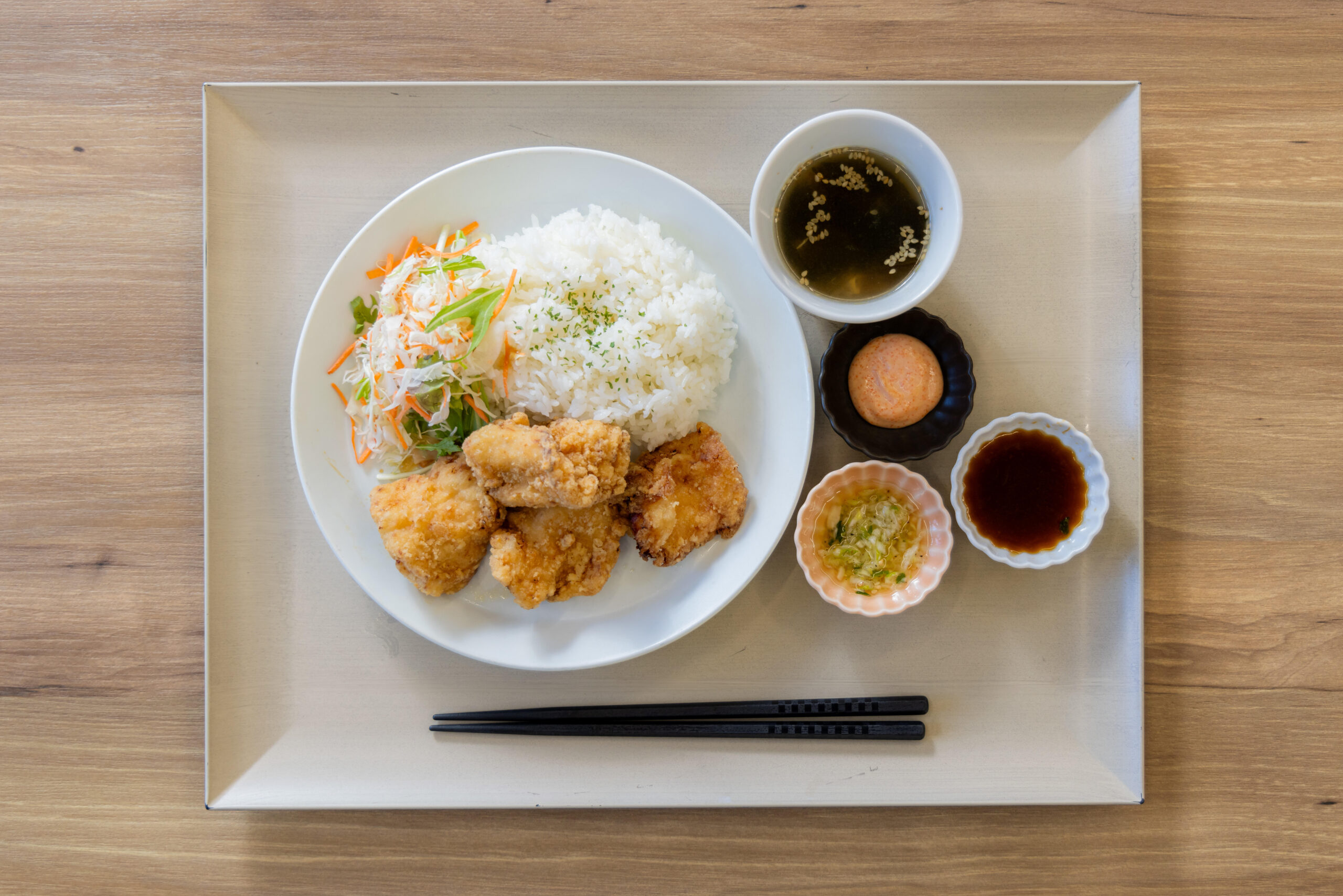 調査結果から導いた「珍しさ・ボリューム感・ジューシーさ」を考慮したメニュー開発を行いました。肉を酒粕に漬け込むとやわらかくジューシーになることに着目し、メイン料理を学食メニューで人気の鶏のから揚げにアレンジを加えました。ソースを4種類用意することで珍しさ、楽しさを加え、そのうち2種類のソースに酒粕を活用しています。