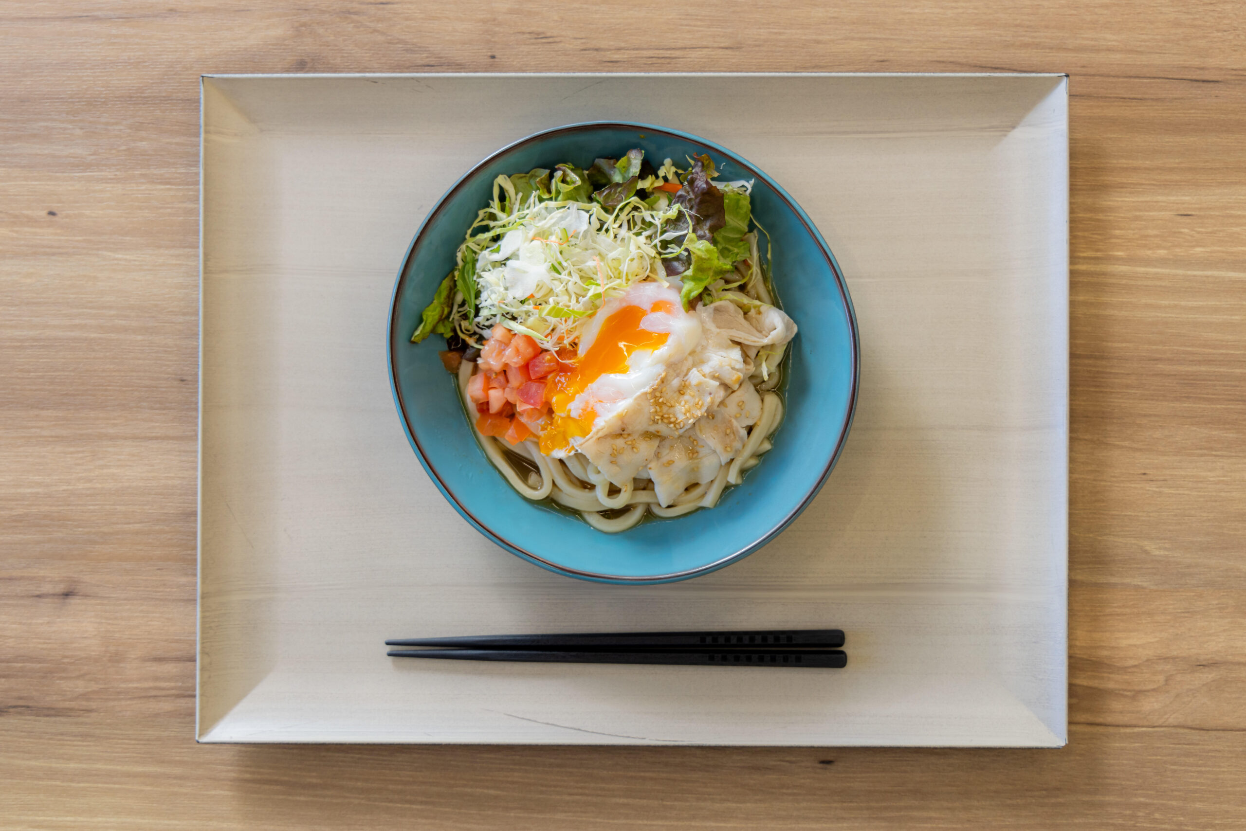 「野菜を多くとりたい、ヘルシーなメニューが欲しい、酒粕にはお肉料理が合うのではないか」という調査結果から、うどんに野菜と肉を多く取りいれることができるサラダうどんを考案しました。サラダうどんにかけるタレに酒粕を加え、酒粕入りバンバンジーダレにしました。5月以降のメニュー展開を考え、暑い日にぴったりのメニューです。