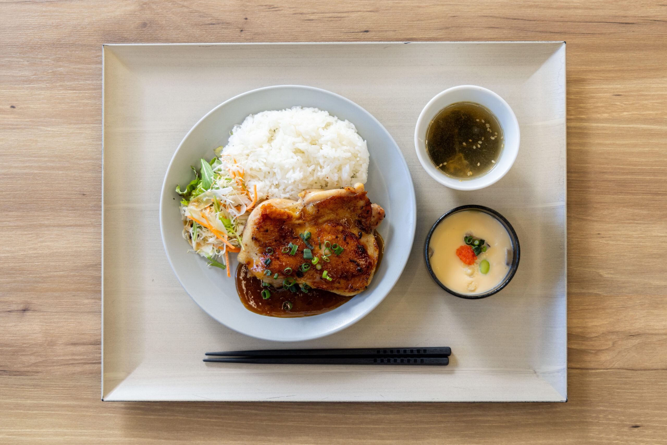 学食の定番メニューに少ない日本食に着目し、「甘じょっぱい味付けの日本食メニュー」を考えました。メインの鶏の照り焼き風は、鶏を酒粕に漬け込むことでやわらかさを追求、副菜の茶碗蒸しにも酒粕を活用しています。酒粕になじみがない人でも酒粕の風味を感じつつ、食べやすいメニューです。