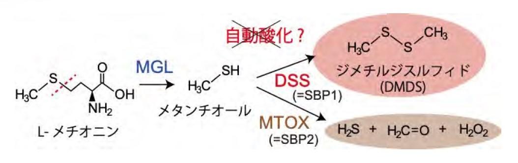 2. 特定した遺伝子の一つがジメチルジスルフィドを生合成する新発見の酵素の遺伝子であることを解明し、これをジスルフィドシンターゼ(DSS)と命名。