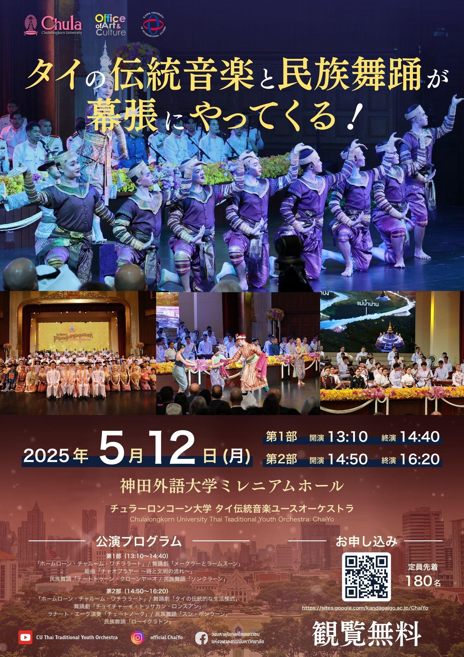 神田外語大学(千葉市美浜区/学長:宮内孝久)は、2025年5月12日(月)に、タイの名門チュラーロンコーン大学の伝統音楽ユースオーケストラ「ChaiYo(Chulalongkorn University Thai Traditional Youth Orchestra)」を迎え、伝統音楽と舞踊による特別公演を開催します。本公演では、タイの格式高い古典芸能を学ぶ若者たちが来日し、タイ伝統楽器によるオーケストラ演奏と華やかな民族舞踊を披露します。チュラーロンコーン大学との学術連携(MOU)を背景に実現した本イベントは、教育と地域貢献を結ぶ文化交流の機会として、異文化理解を促す場となることが期待されます。観覧は無料・事前申込制で、どなたでもご参加いただけます。