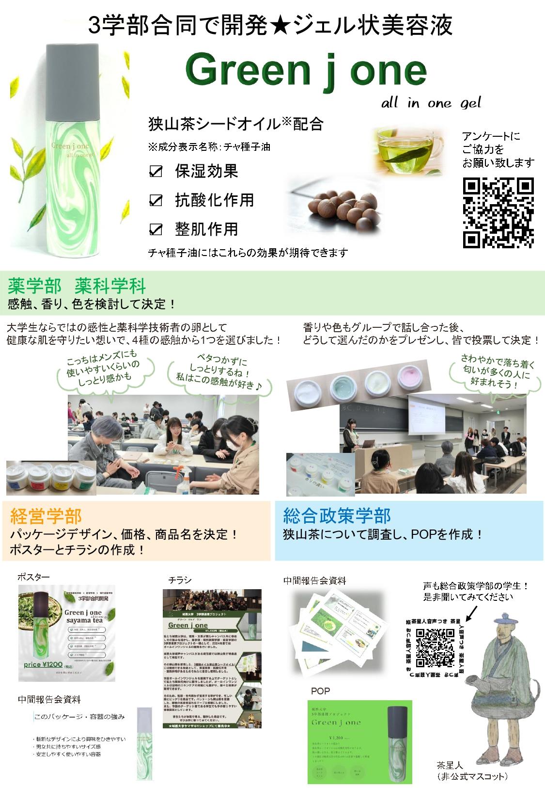 城西大学の学生による「3学部連携プロジェクト」が、狭山茶の成分を配合したジェル状美容液「Green j one」を開発 ― 構内およびオンラインの「JOSAIサポート」で販売