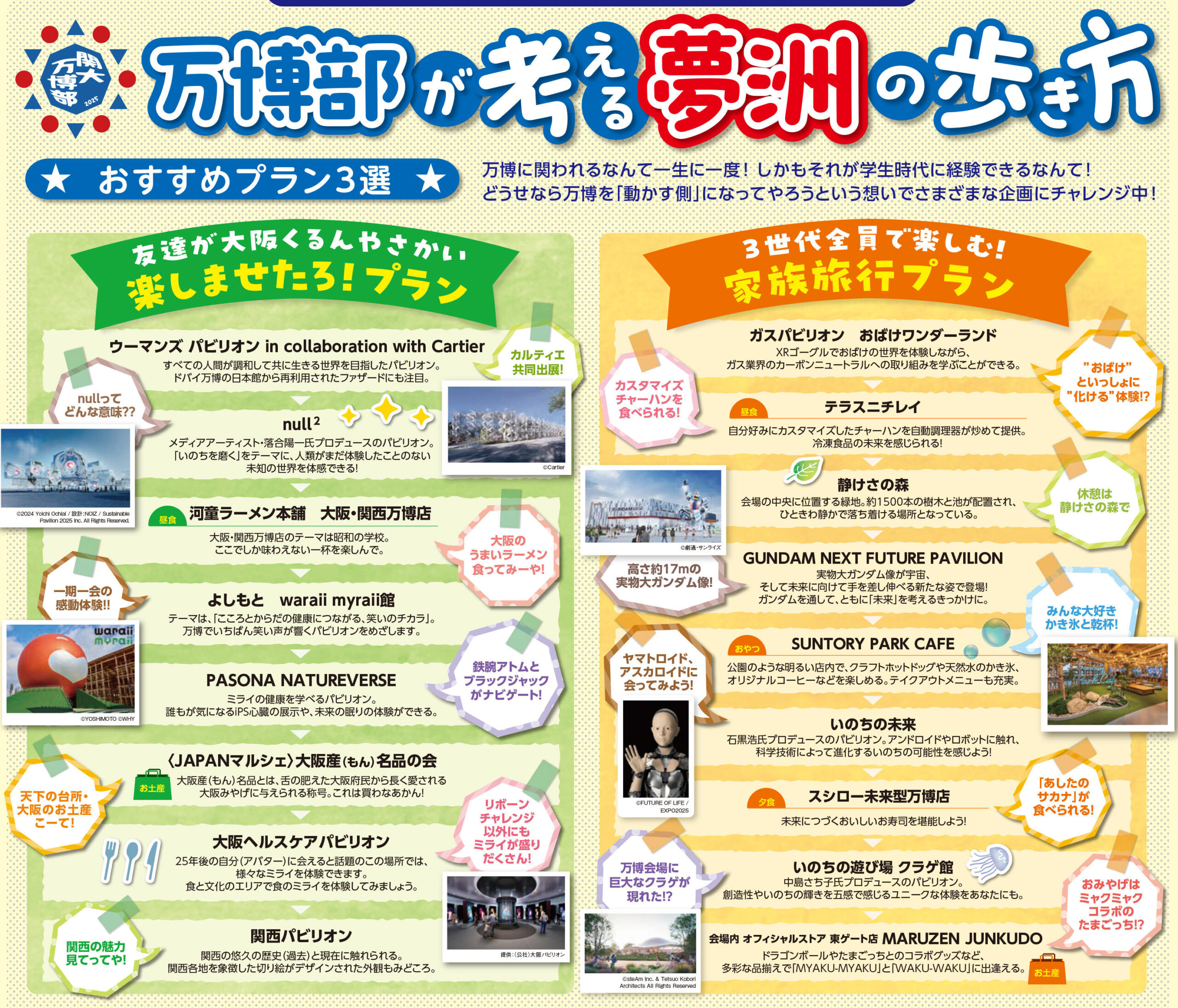 また、これらの取組の全体像をまとめた情報紙『関大万博通信』には、イベントカレンダーや各出展内容の詳細情報、さらに関大万博部が考案した夢洲周遊プラン3選などを掲載。今後、関大万博関連イベントで配布し、万博のワクワクを多くの方に届けていきます。
