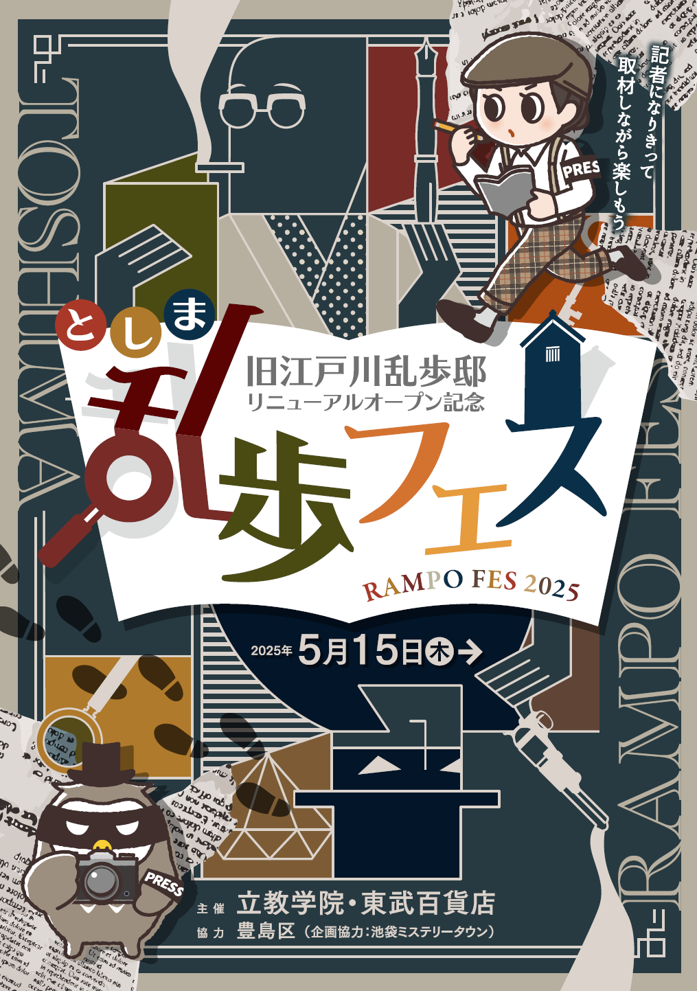 本イベントは、立教学院と東武百貨店が連携して主催する『としま乱歩フェス』(協力:豊島区、企画協力:池袋ミステリータウン)のひとつとして位置づけられ、『としま乱歩フェス』ではこのほかにも東武百貨店や池袋駅周辺でさまざまなイベントを実施。乱歩が暮らした池袋の地が一体となって「旧江戸川乱歩邸」のリニューアル、そして乱歩の没後60年を盛り上げます。