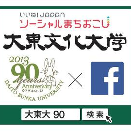 大東文化大学は2013年9月20日(金)の創立90周年を迎えるにあたり、昨年10月に90周年事業委員会を発足。在学生や卒業生、教職員らに感謝の気持ちを伝えるとともに、さらに自校に対する愛着や誇りをもてるような取り組みを計画してきた。このたび、その一環としてSNS(ソーシャル・ネットワーキング・サービス)「Facebook」に特設ページを開設。校舎周辺の飲食店などと連携した投稿やFacebookクーポンの配信を通じて卒業生や地域住民らとの「繋がり」を深めることを目指す。なお、この取り組みは10月1日(火)にFacebookナビの公式サイト「いいね! JAPAN ソーシャルまちおこし」で紹介されたほか、10月14日(月・祝)にテレビ東京にて特集番組(朝8:30~8:59)でも放映される予定。