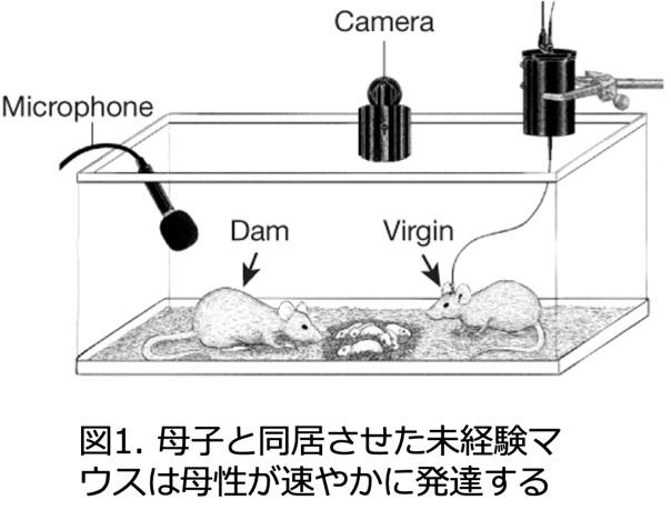 ・育児経験のないメスマウスが子育て中の母マウスと過ごすことで母性がすみやかに発達しました(図1)。