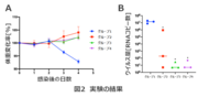 実験の結果、VHH抗体を投与しなかったグループ1のみ体重の減少が確認されました(図2A)。新型コロナウイルスに感染したシリアンハムスターは体重減少の症状がみられることが知られているため、VHH抗体を投与したグループ2、3、4は新型コロナウイルスの感染によって引き起こされる症状を緩和したことが確認されました。また、肺におけるウイルス量を測定したところ、VHH抗体を投与しなかったグループ1と比較して、VHH抗体を投与したグループ2、3、4ではウイルス量が少ないことが確認されました(図2B)。これはVHH抗体が新型コロナウイルスの増殖を抑制したことを示し、VHH抗体による新型コロナウイルスの増殖抑制効果によりシリアンハムスターの体重減少の抑制につながったと考えられました。