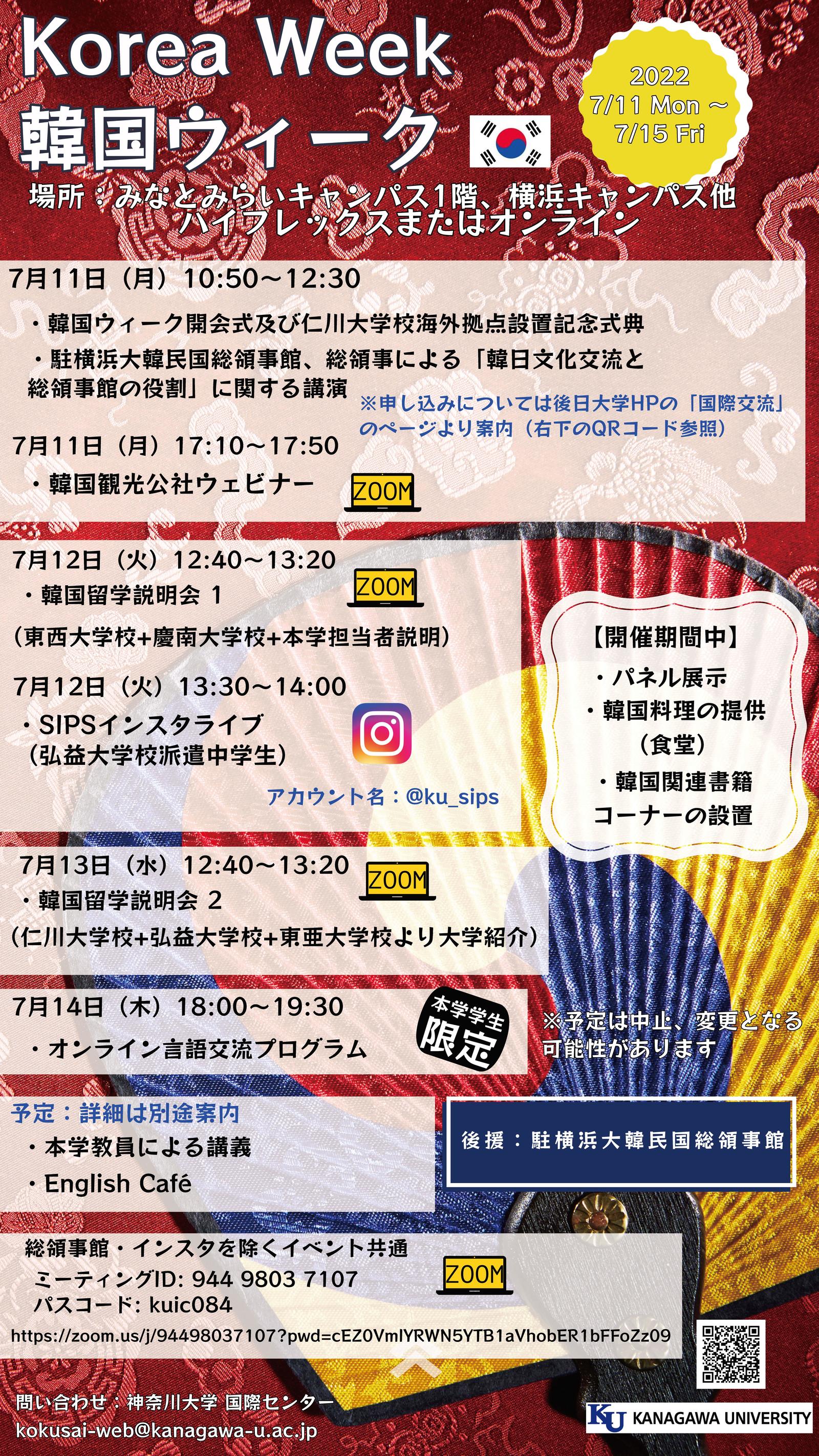 期間中、駐横浜大韓民国総領事館総領事によるご講演、韓国観光公社によるウェビナー、本学教員による講義、韓国留学説明会、韓国料理の提供、学生によるインスタライブ、韓国協定校との言語交流プログラムなどをご用意しています。