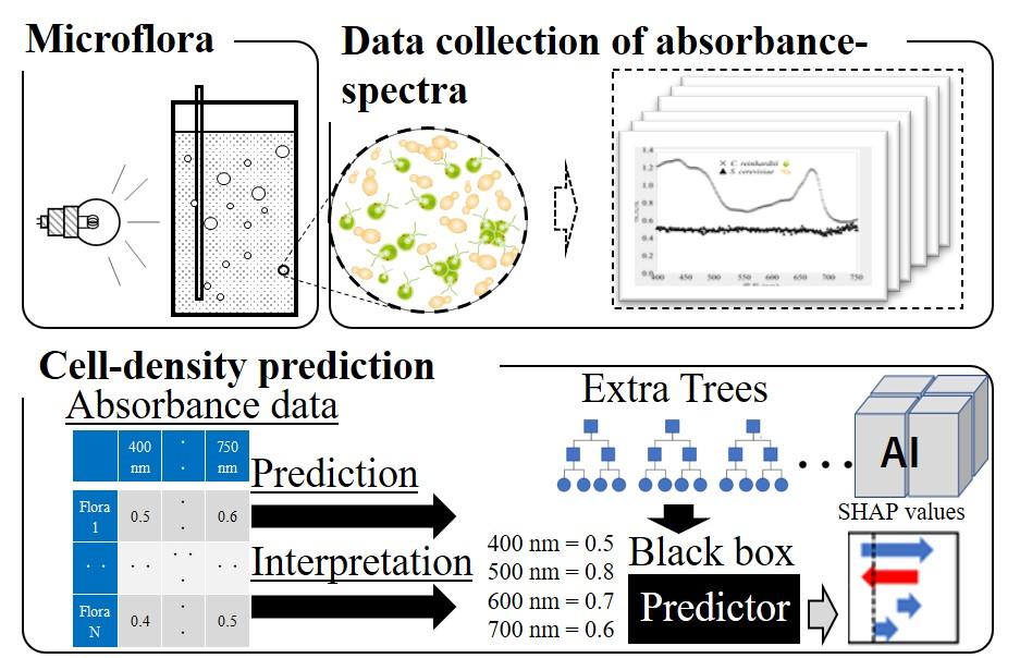 本研究では、微生物共培養系の物質生産において大きな影響を与える細胞密度に着目し、これをAIを用いて迅速に評価するシステムの構築を図りました。具体的には微生物混合液から得られる吸光スペクトルデータをAIで解析することで、それらのデータを網羅的に理解し、条件に応じて細胞密度を予測するシステムの開拓を目指しました。緑藻と従属栄養微生物の混合液について、吸光スペクトルの各波長を特徴量としてそれぞれの細胞密度をAIによって予測する方法を提案し、緑藻中のクロロフィルに特有の吸収帯の吸光度の情報に基づき、同方法の構築および原理を解明しました(図1)。