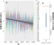図3.状態空間モデルによる予測結果。(a)状態空間モデルで予測された初鳴日の経年変化。折れ線は各気象台で記録されたアブラゼミの初鳴日の実測データを表し、黒太線は状態空間モデルで予測された初鳴日の予測値を、灰帯はモデルで予測された95%信用区間を表している。(b)推定されたパラメーターの回帰係数の95%信用区間。太・細エラーバーは、それぞれ推定された回帰係数の75パーセンタイル値と95パーセンタイル値を表す。気温の効果が統計的に顕著な負の効果を持っていたことから、気温の上昇が初鳴日を早めていることを意味する