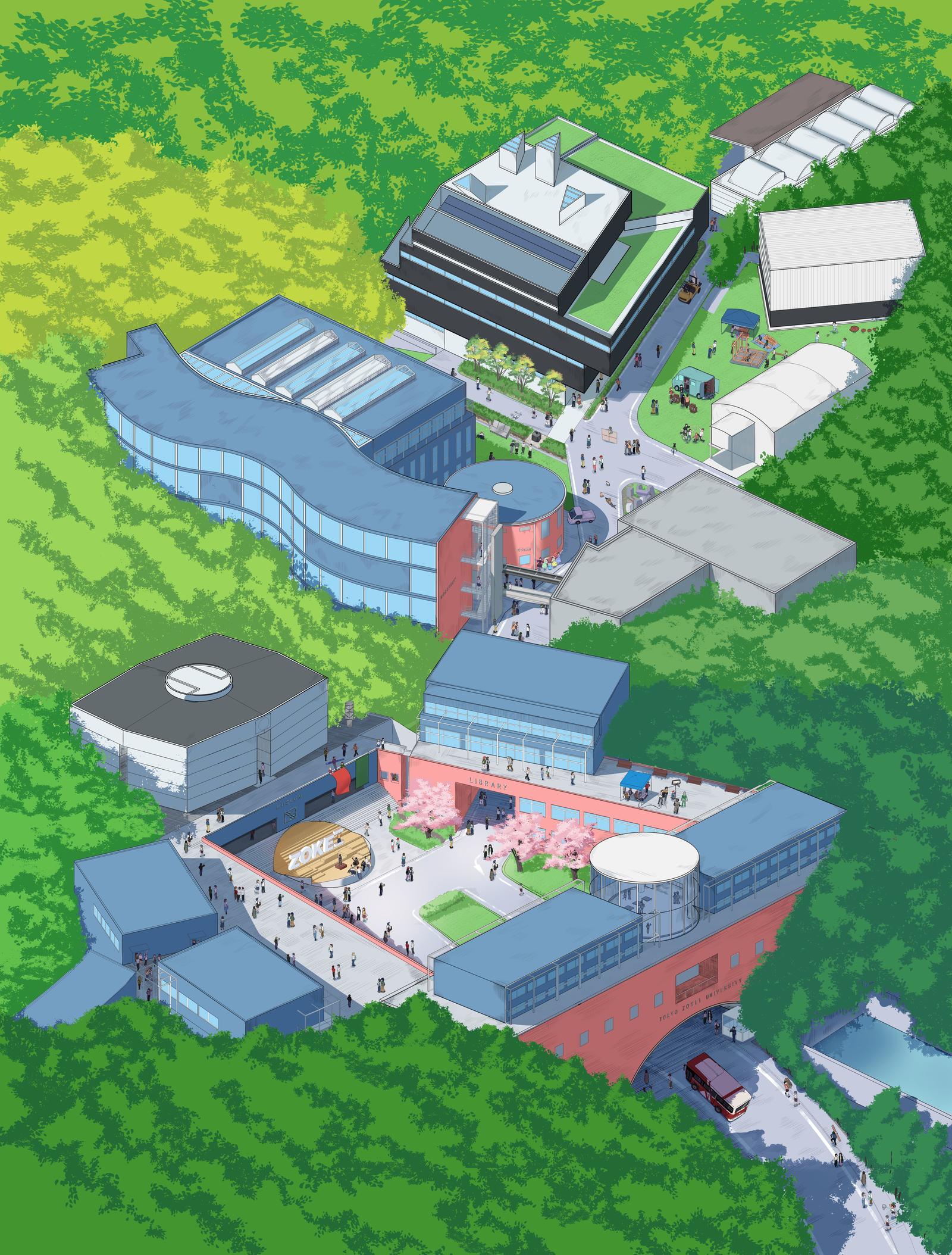 本展は、建築模型、版画、イラストレーション、写真、デジタルメディア、テキスタイルなど、それぞれの得意ジャンルを活かして多数の教員、学生が参加してつくりあげる展覧会です。新しいキャンパスに込めた磯崎新の思い、自由奔放に学び遊んだ学生たち、森の環境を活かした学修プログラムなど、キャンパスを軸にした活動の広がりをご紹介いたします。