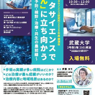 学校法人根津育英会武蔵学園(東京都練馬区/理事長︓根津公一)は、武蔵学園データサイエンス研究所講演会「データサイエンスで「がん」に立ち向かう~予防・検診・治療・共生の最前線~」を11/1(土)に開催いたします。日本のがん診療は、データサイエンスの力で大きく進歩しています。がんの種類ごとに最適な治療の選択がしやすくなっているのはもちろん、地域ごとの診療の内容や質を標準化していく取り組みも進んでいます。また、全国のがん診療の質を高めていくための政策決定にも、データが多く用いられています。 本講演では、がん患者の生存解析や、がん統計資料に基づくがん対策の評価などを専門とされる伊藤ゆり先生より、データサイエンスの力でがんに向き合う最新の知見をご紹介いただきます。 どなたでもお申込いただけますので、ぜひご参加ください。