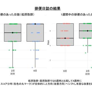 食物繊維の低摂取および高摂取グループでは2週間の摂取でJPAC-QOLスコアが有意に改善しました。また、排便のあった日数については、低摂取および高摂取グループともに4週間の摂取で有意に改善しました。
