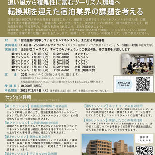 明海大学(千葉県浦安市/学長:中嶌裕)ホスピタリティ・ツーリズム総合研究所は、観光庁「産学連携による観光産業の中核人材育成・強化事業」における実績と、産学連携によって得た業界の知見を基に、日本の観光産業の未来を担う人材を対象に「マネジメント力を高める!宿泊施設のための中核人材育成プログラム第8期」を開催する。