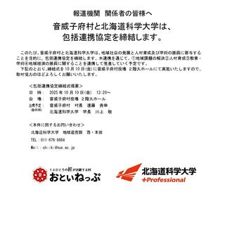 下記のとおり、締結式を10月10日(金)に音威子府村役場 2階大ホールにて実施いたしますので、取材協力のほどよろしくお願いいたします。
