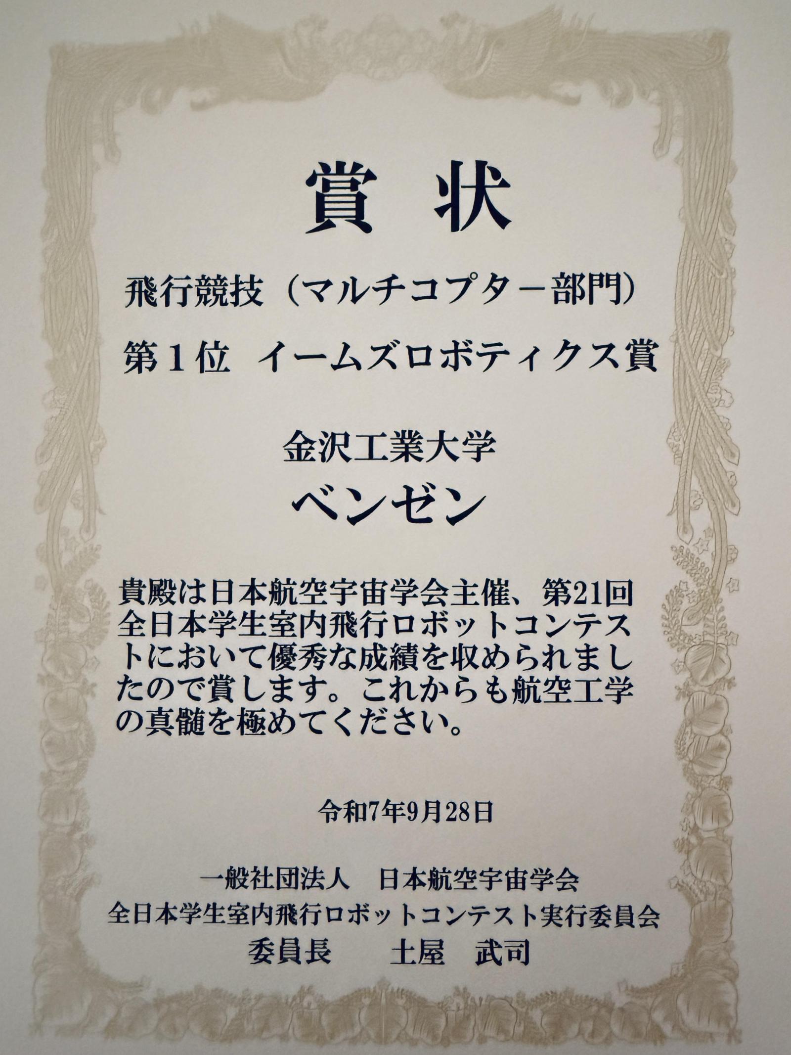 第21回「全日本学生飛行ロボットコンテスト大会」(主催:一般社団法人 日本航空宇宙学会)が2025年9月27日(土)・28日(日)の2日間、日本工学院アリーナ(東京都大田区)で行われ、マルチコプター部門に出場した金沢工業大学ロボティクス学科チームが初の1位になりました。