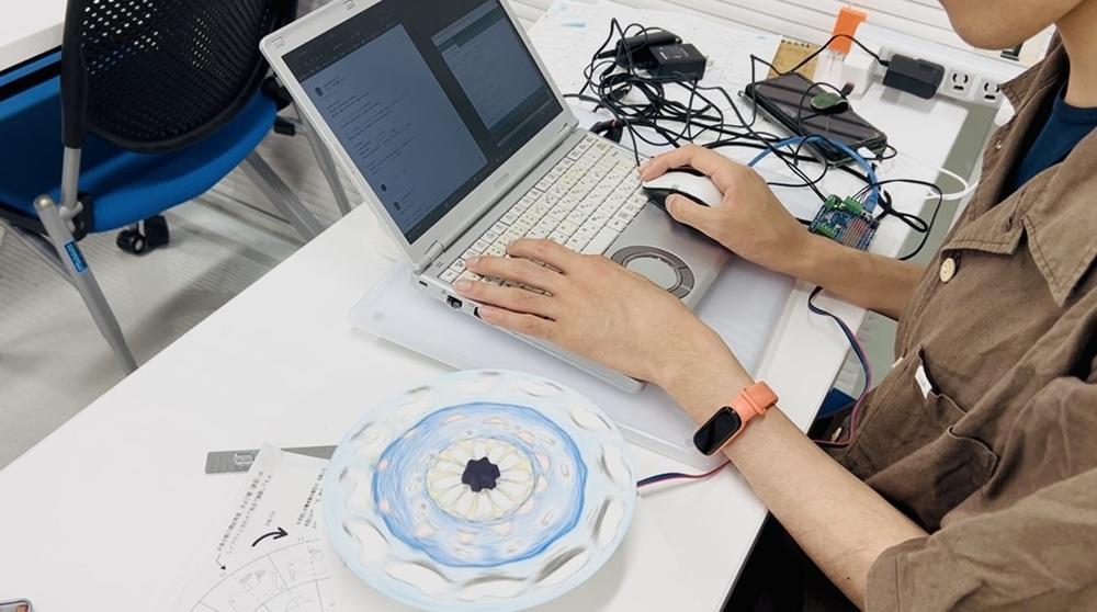 また、通常「驚き盤」は手で回して動きを体感するが、自動制御で同様の効果を得ることができる、断続的回転をする「ステッピングモータ」の制御回路の製作にも取り組んだ。学生は電子工学の基礎技術に関する講義を受けたうえで、モータを制御するためのプログラミングを作成するなど、工学的な知識と技術を習得した。