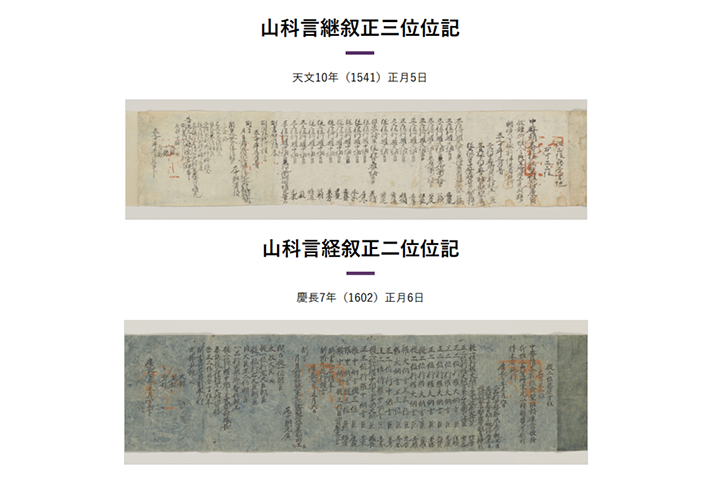 なかでも、室町幕府の将軍・足利義持が自ら筆をとって命を下した「直筆の御内書」は、将軍の肉筆がそのまま残る稀少な史料です。また公家・山科言継・言経二代の位記は、誰がいつどの位に叙されたのかを公式に記した「身分の証明書」で、室町期から近世初頭の位記は残存例が少なく極めて貴重なうえ、故実に則って作成された言経位記と故実から外れた言継位記を比較することでそれぞれの時代相をうかがうことができます。