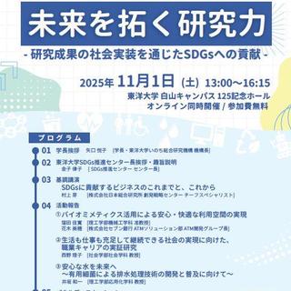 東洋大学(東京都文京区/学長 矢口悦子)は、「東洋大学SDGs推進センター」と「東洋大学いのち総合研究機構」の共催で、研究成果の社会実装に取組む3つの研究プロジェクトを事例に、研究活動によるSDGsへの貢献を考えるシンポジウム『未来を拓く研究力―研究成果の社会実装を通じたSDGsへの貢献―』を2025年11月1日(土)に白山キャンパス125記念ホールで開催いたします。