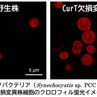 図1 シアノバクテリア(Synechocystis sp. PCC 6803)野生株とCurT欠損変異株細胞のクロロフィル蛍光イメージ