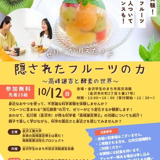 金沢工業大学 バイオ・化学部 生命・応用バイオ学科の学生による「未来の高峰譲吉博士は君だ! 発酵産業活性化プロジェクト」では、このたび、「【親子で実験】隠されたフルーツの力~高峰譲吉と酵素の世界~」を10月12日(日)13時から16時まで金沢学生のまち市民交流館(金沢市片町2丁目5番17号)で開催します。