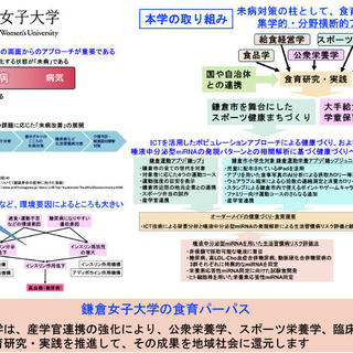 鎌倉女子大学は、食育を未病対策の柱と位置づけ、国や自治体との連携、企業との連携を通して、集学的・分野横断的な食育研究・実践を、ゼミナール活動を中心に展開しています。例えば、鎌倉市および食品企業との連携によるスポーツ健康まちづくりデザイン研究や、大手給食会社と協働した学童保育施設での栄養教育活動を推進しています。