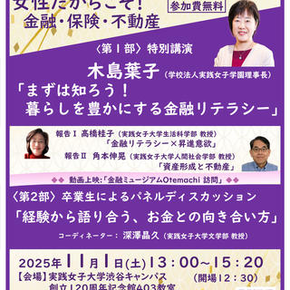 実践女子大学下田歌子記念女性総合研究所(所長:高橋桂子・生活科学部教授)は11月1日(土)に渋谷キャンパスで、公開シンポジウム「女性だからこそ!金融・保険・不動産」を開催します。近年注目を集める「金融リテラシー」をテーマに掲げ、大学生を中心に、自ら考え・判断し、社会と主体的に関わる力を育むことを目的としています。講演や卒業生によるパネルディスカッションを通じて、金融にあまり関心がない人を含め、来場者が「暮らしとお金」の多様な関わりを知り、自分らしい人生を選択するためのヒントや気づきを提供します。