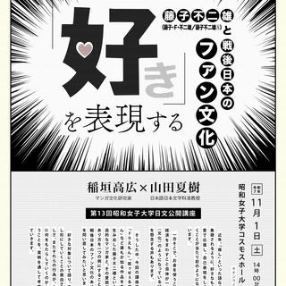 昭和女子大学(学長 金尾朗:東京都世田谷区) 人間文化学部 日本語日本文学科は、第13回公開講座「「好き」を表現する 藤子不二雄(藤子・F・不二雄/藤子不二雄Ⓐ)と戦後日本のファン文化」を11月1日に開催します(参加費無料)。国民的なマンガ家、藤子不二雄とその愛読者のあり方を一つの例に戦後日本のファン文化のあり方を考えていきます。