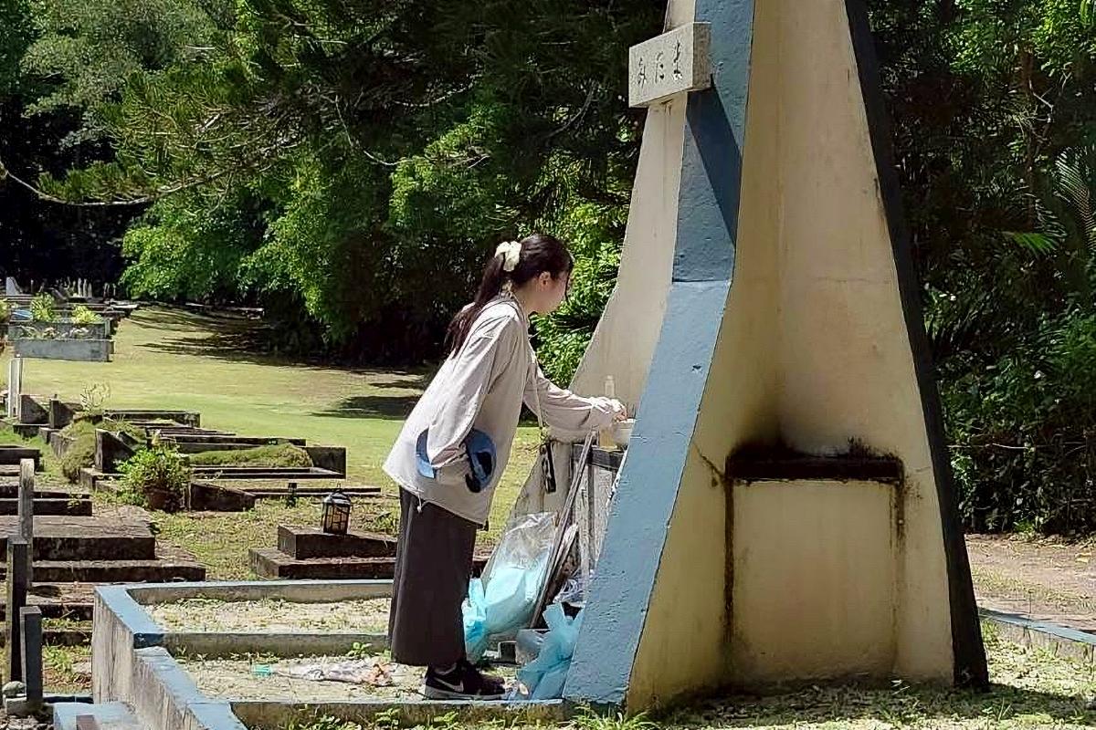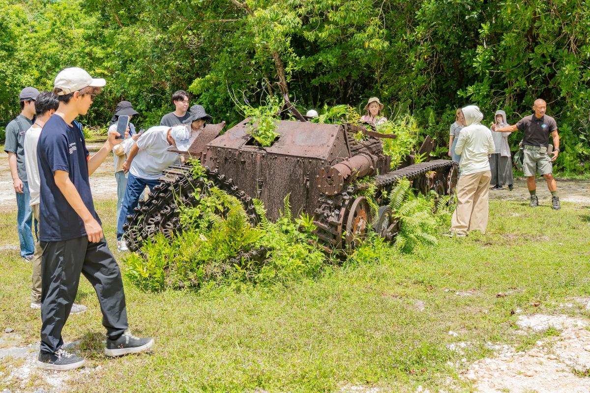 かつての激戦地ペリリュー島では、現地日本人ガイドから説明を受けながら、千人洞窟や海軍司令部跡、平和記念公園やオレンジビーチ、滑走路付近などを訪れました。爆撃を受けた建物や壁に残る弾痕、破壊され錆び付いた戦車、激しく損傷した兵士の所持品などを各所で目の当たりにし、学生らは戦争の悲惨さを強く感じました。また、戦没者慰霊碑の前では全員で黙祷を行い、線香を手向け、平和への思いを共有しました。多くの戦跡を巡りながら当時の状況を理解し、平和について考える、意義深い機会となりました。