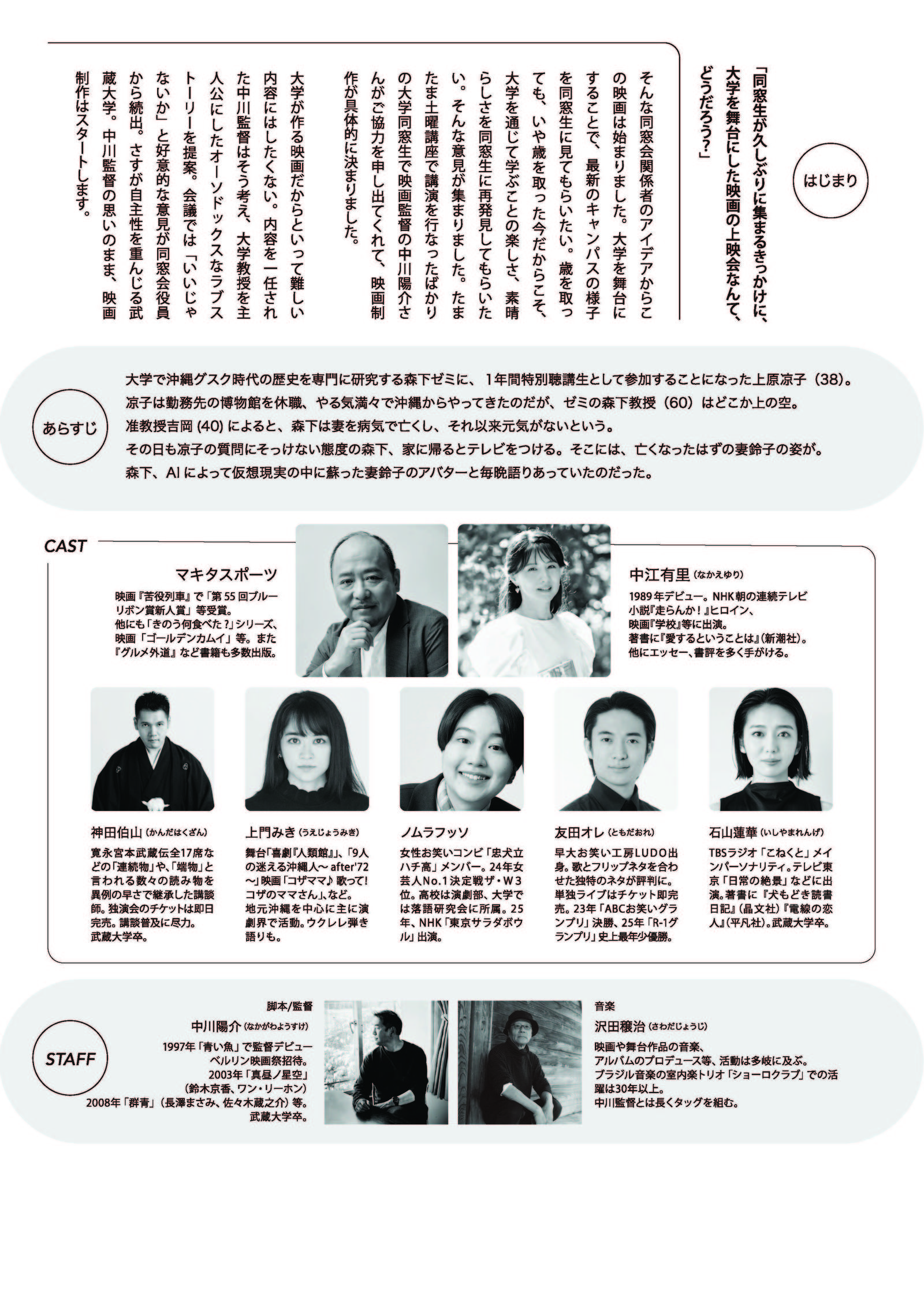 武蔵大学(東京都練馬区/学長 髙橋徳行)は、武蔵大学同窓会の設立70周年を記念し、卒業生で映画監督の中川陽介氏の協力のもと、本学を舞台にした映画「夢で会えたら」を制作し、このたび完成いたしました。本作品では在学生もエキストラ出演や制作スタッフ等として参加し、大学が一体となって取り組んだ記念すべきプロジェクトです。完成を記念し無料上映会を実施します。この機会にぜひご覧ください。