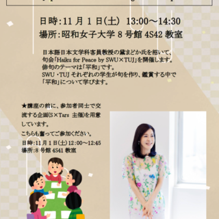 昭和女子大学(東京都世田谷区:学長 金尾朗)日本語日本文学科は、11月1日(土) に日本文化ワークショップ「Haiku for Peace by SWU x TUJ」を米国ペンシルベニア州立テンプル大学ジャパンキャンパス(東京都世田谷区:学長 マシュー・ウィルソン、以下TUJ)の日本語学科と共催します。俳人黛まどか客員教授(以下、黛客員教授)の指導のもと、日米の学生が「Peace - 平和」をテーマにした句を作り、鑑賞する中で平和について学びます。